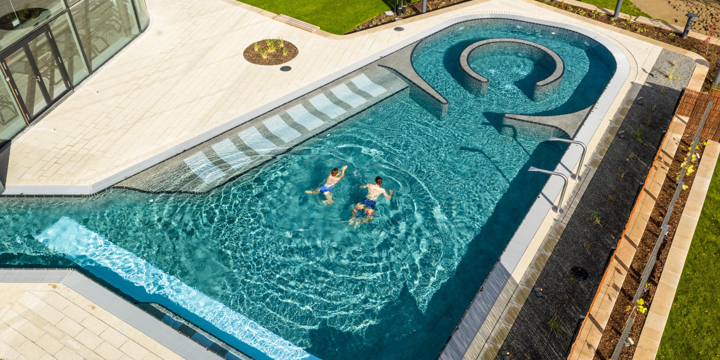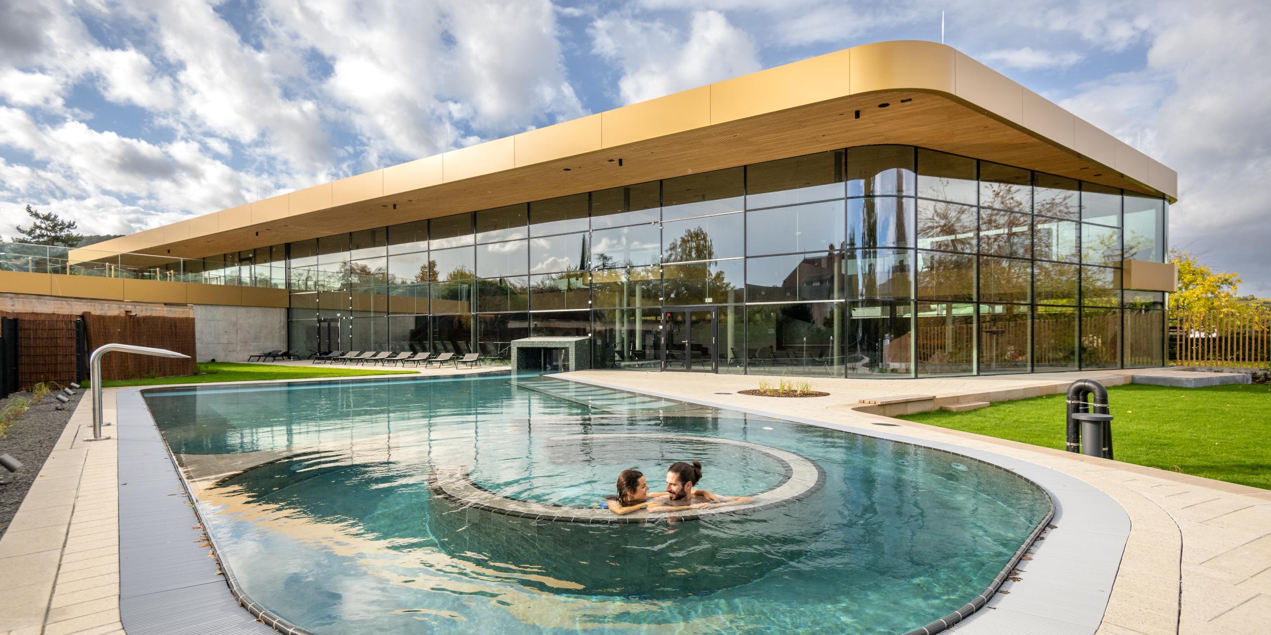 Von dort aus können Sie sich im ganzjährig geöffneten Warmaußenbecken entspannen.