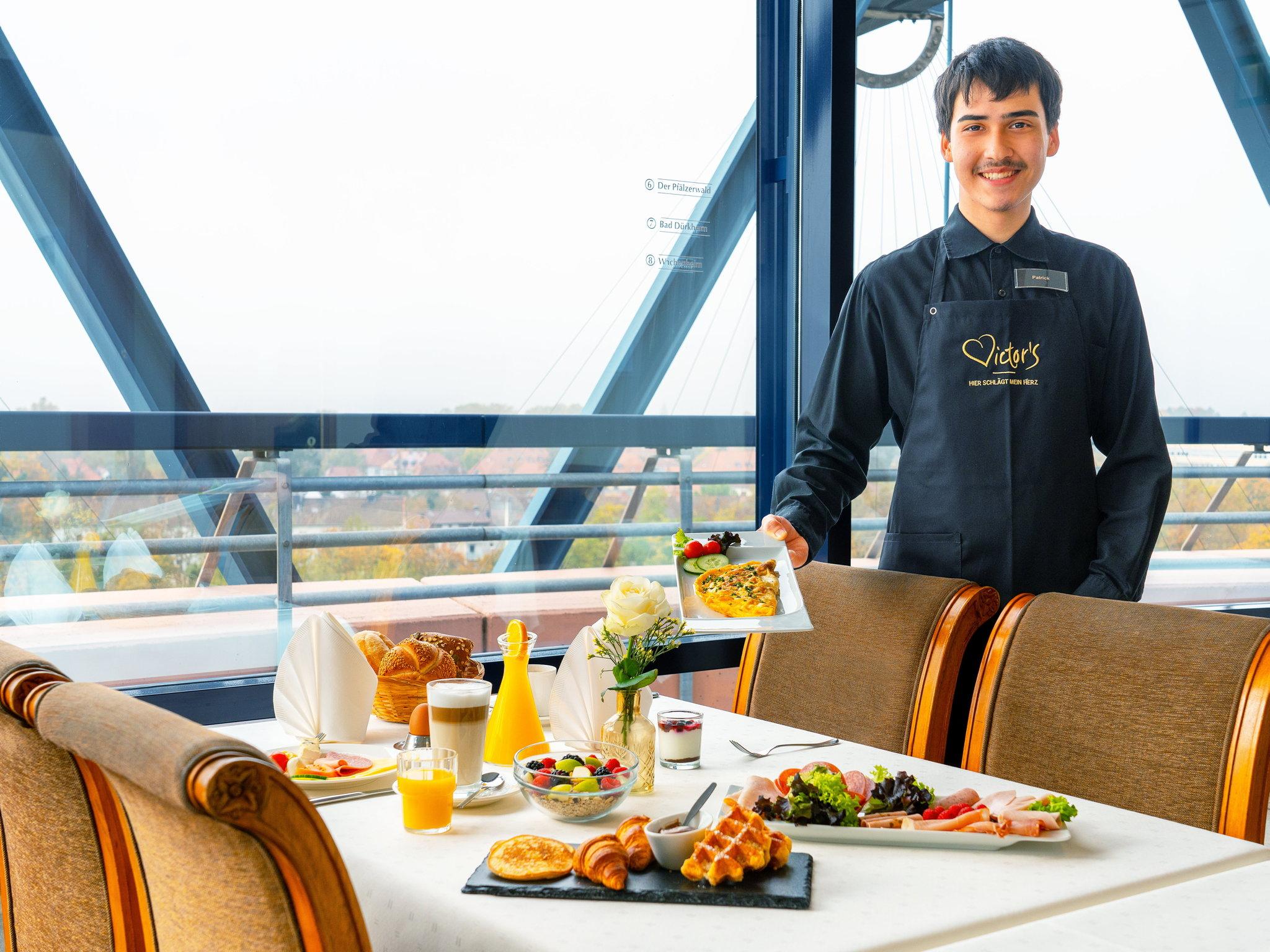 Frühstücken Sie doch einmal mit 360 Grad Aussicht über den Dächern von Frankenthal! Das komfortable Stadthotel mit dem beliebten Panorama-Café ist der ideale Ausgangspunkt für Ihre Ausflüge. Genießen Sie feine Snacks, Flammkuchen, Antipasti, Pizza und coole Drinks in unserer Victor's Bar. Die zentrale Lage des Hotels, direkt neben dem CongressForum Frankenthal, gegenüber der Fußgängerzone, garantiert eine hervorragende Anbindung ans Rhein-Main-Neckar-Gebiet, ganz gleich, ob mit dem PKW oder mit der Bahn. Innerhalb weniger Minuten erreichen Sie den Autobahnanschluss zur Autobahn A6 oder den Hauptbahnhof und sind schnell in Speyer, Worms, Schwetzingen, an der Deutschen Weinstraße, in Ludwigshafen, Mannheim, Heidelberg, Frankfurt, am Speyerer oder dem Wormser Dom und im Pfälzerwald. Es stehen ausreichend Parkplätze am CongressForum nebenan (gebührenpflichtig), sowie öffentliche Parkplätze in wenigen Gehminuten zur Verfügung.